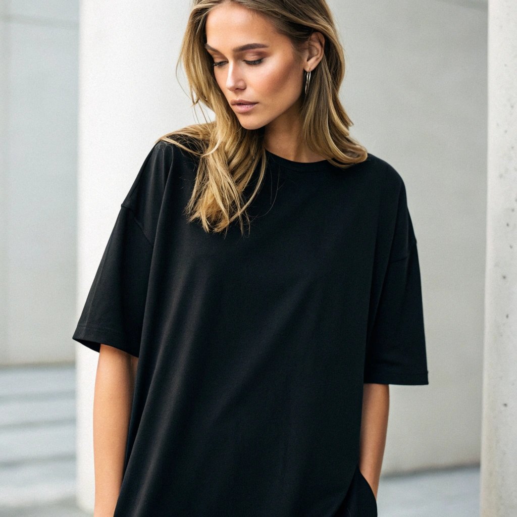 Whether you’re dressing it up with accessories or keeping it simple, this black oversized tee is your go-to for understated elegance and comfort.